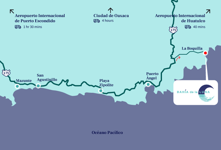 Tu oasis de calma y belleza natural en Playa La Boquilla, se encuentra a solo 40 min en auto del aeropuerto internacional de Huatulco y a 1 hora 30 min del aeropuerto internacional de Puerto Escondido. Ofrecemos transportación por un precio adicional. Envíanos un mensaje para saber más.